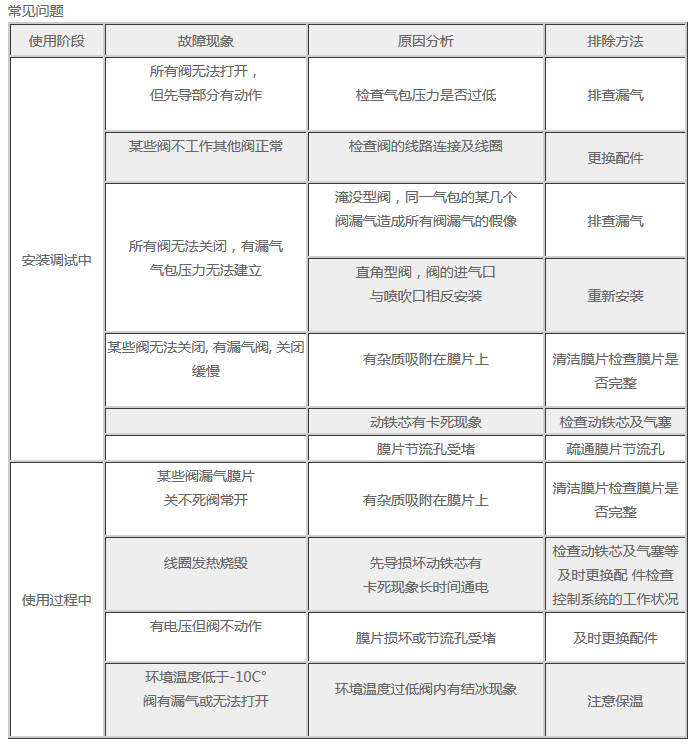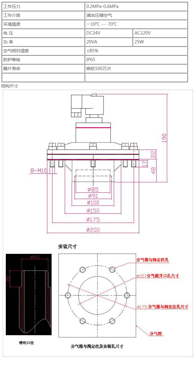 6. 該閥與氣包及噴吹連接管的密封件適用溫度為-10℃~70℃。如需高溫密封件,請訂購時另行注明。