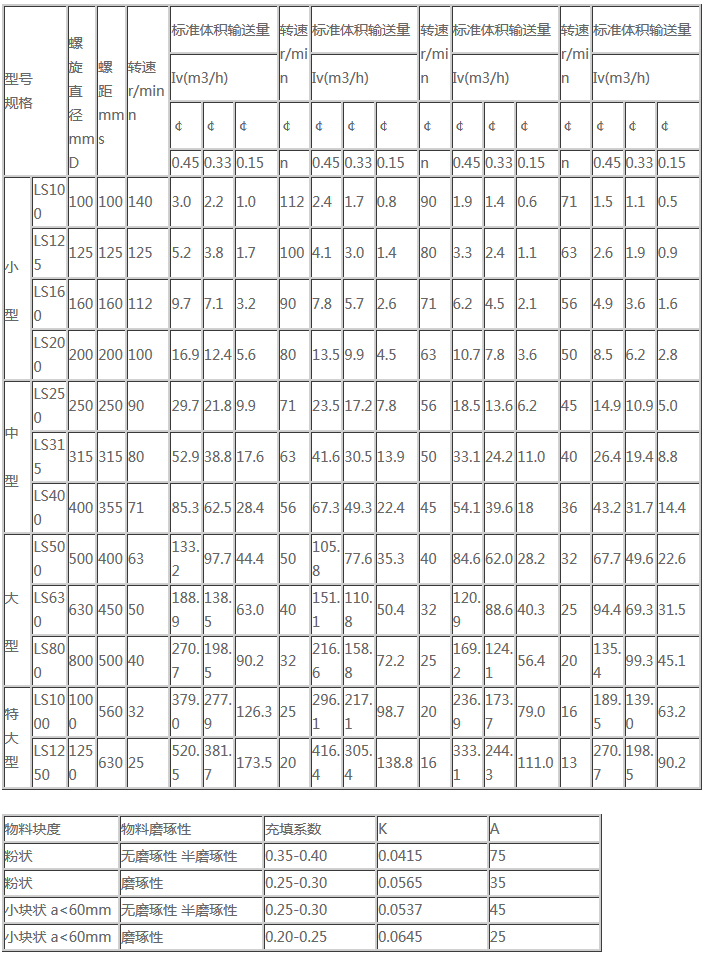 分小、中、大、特大型共十二種規(guī)格,根據(jù)所輸送物料的類(lèi)別,有三種填充系數(shù)(ф=0.45,0.33,0.15)四種轉(zhuǎn)速可選擇。