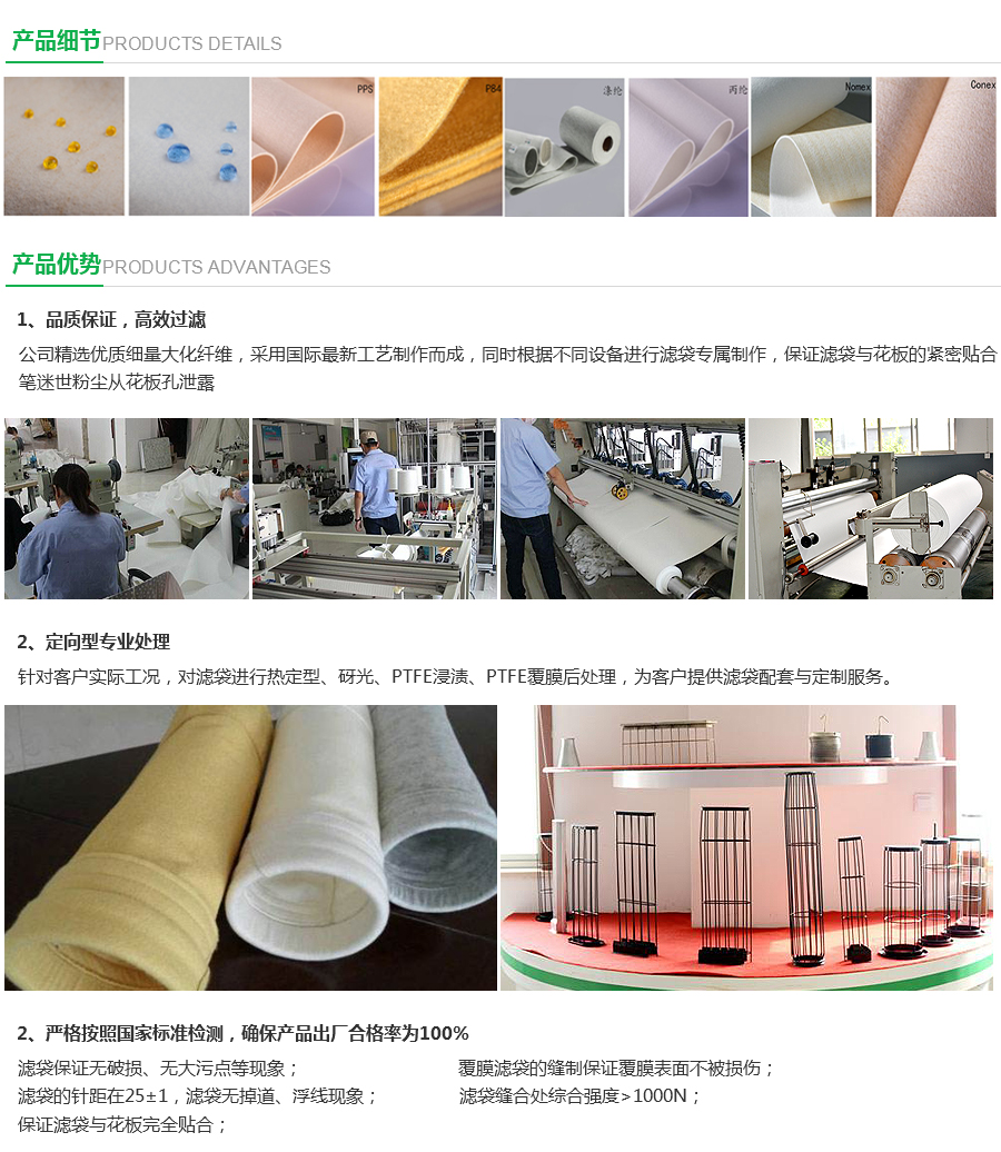 我們對(duì)針刺氈濾料采用碳氟樹脂和PTFE浸漬處理的防油防水(拒水防油)處理,其對(duì) 濕含塵氣體(尤其對(duì)吸水性、潮解性粉塵) 濾袋的表面更易捕集粉塵,避免和減輕糊袋現(xiàn)象的發(fā)生。