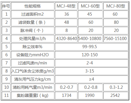 MCJ-48型、60型、80型脈沖袋式集粉器其結(jié)構(gòu)與工作原理:它由上、中、下箱體、排灰系統(tǒng)及噴吹、清粉系統(tǒng)五部分組成。上箱體包括可掀起 的蓋板和出風(fēng)口;中箱體內(nèi)有多孔板、濾袋、骨架及文氏管;下箱體由料斗、支架、進(jìn)風(fēng)口檢查門組成;下料系統(tǒng)由電機、減速機及刮板組成,噴吹管和氣包。